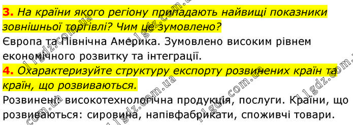 3. На країни якого регіону припадають найвищі показники зовнішньої торгівлі? Чим це зумовлено? Європа та Північна Америка. Зумовлено високим рівнем економічного розвитку та інтеграції. 4. Охарактеризуйте структуру експорту розвинених країн та країн, що розвиваються. Розвинені: високотехнологічна продукція, послуги. Країни, що розвиваються: сировина, напівфабрикати, споживчі товари.