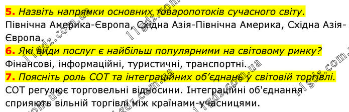5. Назвіть напрямки основних товаропотоків сучасного світу. Північна Америка-Європа, Східна Азія-Північна Америка, Східна Азія-Європа. 6. Які види послуг є найбільш популярними на світовому ринку? Фінансові, інформаційні, туристичні, транспортні. 7. Поясніть роль СОТ та інтеграційних об’єднань у світовій торгівлі. СОТ регулює торговельні відносини. Інтеграційні об'єднання сприяють вільній торгівлі між країнами-учасницями.
