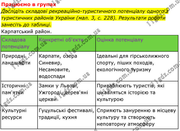 Працюємо в групах Дослідіть складові рекреаційно-туристичного потенціалу одного з туристичних районів України (мал. 3, с. 228). Результати роботи занесіть до таблиці. Карпатський район.