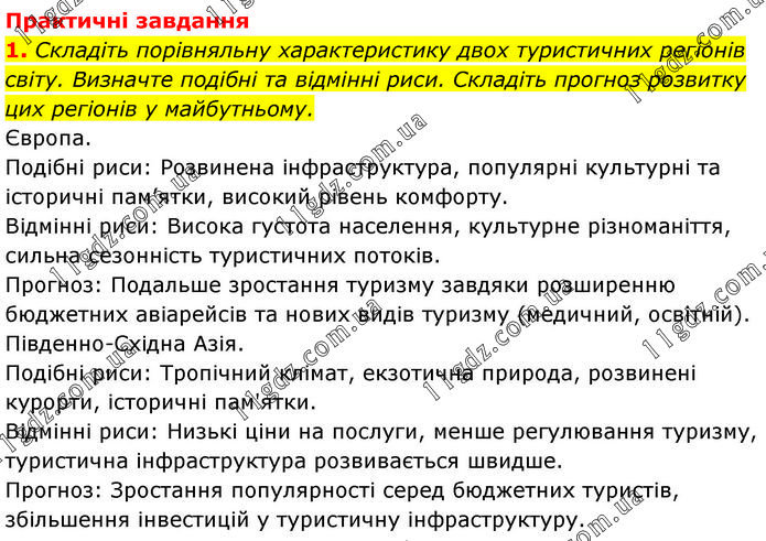 Практичні завдання 1. Складіть порівняльну характеристику двох туристичних регіонів світу. Визначте подібні та відмінні риси. Складіть прогноз розвитку цих регіонів у майбутньому. Європа. Подібні риси: Розвинена інфраструктура, популярні культурні та історичні пам’ятки, високий рівень комфорту. Відмінні риси: Висока густота населення, культурне різноманіття, сильна сезонність туристичних потоків. Прогноз: Подальше зростання туризму завдяки розширенню бюджетних авіарейсів та нових видів туризму (медичний, освітній). Південно-Східна Азія. Подібні риси: Тропічний клімат, екзотична природа, розвинені курорти, історичні пам'ятки. Відмінні риси: Низькі ціни на послуги, менше регулювання туризму, туристична інфраструктура розвивається швидше. Прогноз: Зростання популярності серед бюджетних туристів, збільшення інвестицій у туристичну інфраструктуру.