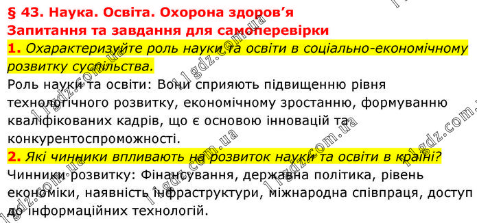 § 43. Наука. Освіта. Охорона здоров’я Запитання та завдання для самоперевірки 1. Охарактеризуйте роль науки та освіти в соціально-економічному розвитку суспільства. Роль науки та освіти: Вони сприяють підвищенню рівня технологічного розвитку, економічному зростанню, формуванню кваліфікованих кадрів, що є основою інновацій та конкурентоспроможності. 2. Які чинники впливають на розвиток науки та освіти в країні? Чинники розвитку: Фінансування, державна політика, рівень економіки, наявність інфраструктури, міжнародна співпраця, доступ до інформаційних технологій.
