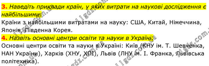 3. Наведіть приклади країн, у яких витрати на наукові дослідження є найбільшими. Країни з найбільшими витратами на науку: США, Китай, Німеччина, Японія, Південна Корея. 4. Назвіть основні центри освіти та науки в Україні. Основні центри освіти та науки в Україні: Київ (КНУ ім. Т. Шевченка, НАН України), Харків (ХНУ, ХПІ), Львів (ЛНУ ім. І. Франка, Львівська політехніка).