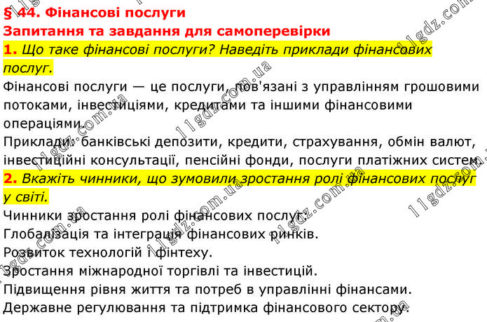 § 44. Фінансові послуги Запитання та завдання для самоперевірки 1. Що таке фінансові послуги? Наведіть приклади фінансових послуг. Фінансові послуги — це послуги, пов'язані з управлінням грошовими потоками, інвестиціями, кредитами та іншими фінансовими операціями. Приклади: банківські депозити, кредити, страхування, обмін валют, інвестиційні консультації, пенсійні фонди, послуги платіжних систем. 2. Вкажіть чинники, що зумовили зростання ролі фінансових послуг у світі. Чинники зростання ролі фінансових послуг: Глобалізація та інтеграція фінансових ринків. Розвиток технологій і фінтеху. Зростання міжнародної торгівлі та інвестицій. Підвищення рівня життя та потреб в управлінні фінансами. Державне регулювання та підтримка фінансового сектору.