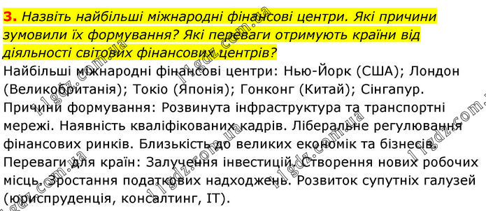 Назвіть найбільші міжнародні фінансові центри. Які причини зумовили їх формування? Які переваги отримують країни від діяльності світових фінансових центрів? Найбільші міжнародні фінансові центри: Нью-Йорк (США); Лондон (Великобританія); Токіо (Японія); Гонконг (Китай); Сінгапур. Причини формування: Розвинута інфраструктура та транспортні мережі. Наявність кваліфікованих кадрів. Ліберальне регулювання фінансових ринків. Близькість до великих економік та бізнесів. Переваги для країн: Залучення інвестицій. Створення нових робочих місць. Зростання податкових надходжень. Розвиток супутніх галузей (юриспруденція, консалтинг, IT).