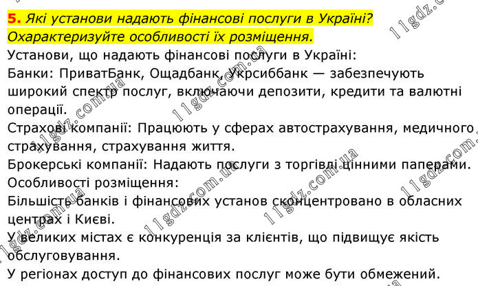 5. Які установи надають фінансові послуги в Україні? Охарактеризуйте особливості їх розміщення. Установи, що надають фінансові послуги в Україні: Банки: ПриватБанк, Ощадбанк, Укрсиббанк — забезпечують широкий спектр послуг, включаючи депозити, кредити та валютні операції. Страхові компанії: Працюють у сферах автострахування, медичного страхування, страхування життя. Брокерські компанії: Надають послуги з торгівлі цінними паперами. Особливості розміщення: Більшість банків і фінансових установ сконцентровано в обласних центрах і Києві. У великих містах є конкуренція за клієнтів, що підвищує якість обслуговування. У регіонах доступ до фінансових послуг може бути обмежений.