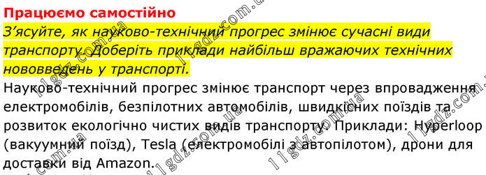 Працюємо самостійно З’ясуйте, як науково-технічний прогрес змінює сучасні види транспорту. Доберіть приклади найбільш вражаючих технічних нововведень у транспорті. Науково-технічний прогрес змінює транспорт через впровадження електромобілів, безпілотних автомобілів, швидкісних поїздів та розвиток екологічно чистих видів транспорту. Приклади: Hyperloop (вакуумний поїзд), Tesla (електромобілі з автопілотом), дрони для доставки від Amazon.