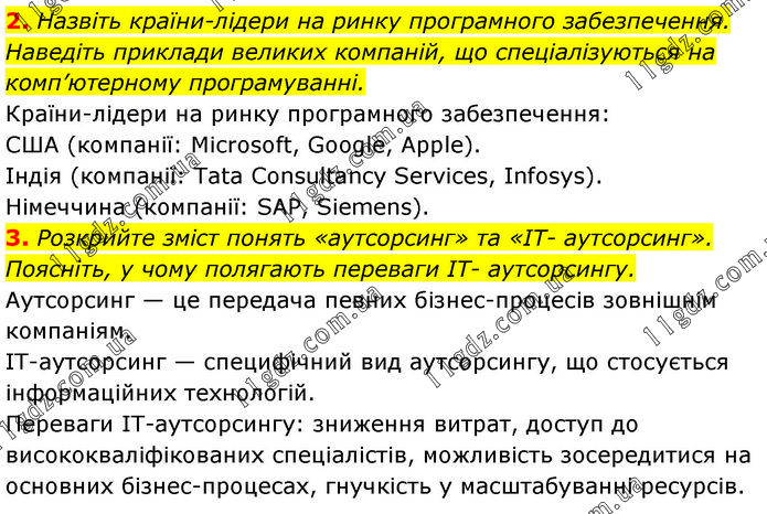 2. Назвіть країни-лідери на ринку програмного забезпечення. Наведіть приклади великих компаній, що спеціалізуються на комп’ютерному програмуванні. Країни-лідери на ринку програмного забезпечення: США (компанії: Microsoft, Google, Apple). Індія (компанії: Tata Consultancy Services, Infosys). Німеччина (компанії: SAP, Siemens). 3. Розкрийте зміст понять «аутсорсинг» та «ІТ- аутсорсинг». Поясніть, у чому полягають переваги ІТ- аутсорсингу. Аутсорсинг — це передача певних бізнес-процесів зовнішнім компаніям. ІТ-аутсорсинг — специфічний вид аутсорсингу, що стосується інформаційних технологій. Переваги ІТ-аутсорсингу: зниження витрат, доступ до висококваліфікованих спеціалістів, можливість зосередитися на основних бізнес-процесах, гнучкість у масштабуванні ресурсів.
