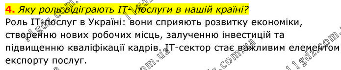 4. Яку роль відіграють ІТ- послуги в нашій країні? Роль ІТ-послуг в Україні: вони сприяють розвитку економіки, створенню нових робочих місць, залученню інвестицій та підвищенню кваліфікації кадрів. ІТ-сектор стає важливим елементом експорту послуг.