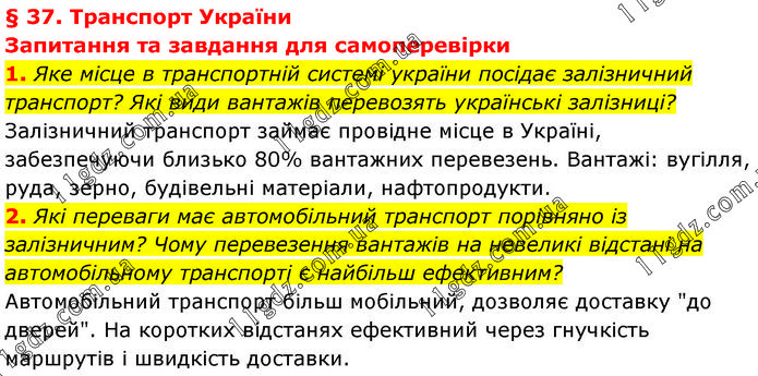 § 37. Транспорт України Запитання та завдання для самоперевірки 1. Яке місце в транспортній системі україни посідає залізничний транспорт? Які види вантажів перевозять українські залізниці? Залізничний транспорт займає провідне місце в Україні, забезпечуючи близько 80% вантажних перевезень. Вантажі: вугілля, руда, зерно, будівельні матеріали, нафтопродукти. 2. Які переваги має автомобільний транспорт порівняно із залізничним? Чому перевезення вантажів на невеликі відстані на автомобільному транспорті є найбільш ефективним? Автомобільний транспорт більш мобільний, дозволяє доставку "до дверей". На коротких відстанях ефективний через гнучкість маршрутів і швидкість доставки.
