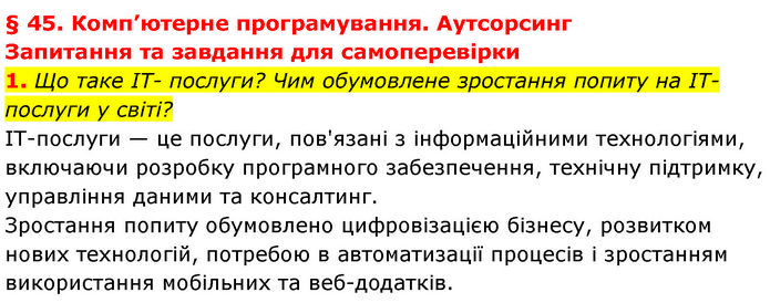 § 45. Комп’ютерне програмування. Аутсорсинг Запитання та завдання для самоперевірки 1. Що таке ІТ- послуги? Чим обумовлене зростання попиту на ІТ- послуги у світі? ІТ-послуги — це послуги, пов'язані з інформаційними технологіями, включаючи розробку програмного забезпечення, технічну підтримку, управління даними та консалтинг. Зростання попиту обумовлено цифровізацією бізнесу, розвитком нових технологій, потребою в автоматизації процесів і зростанням використання мобільних та веб-додатків.