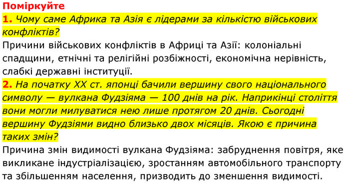 Поміркуйте 1. Чому саме Африка та Азія є лідерами за кількістю військових конфліктів? Причини військових конфліктів в Африці та Азії: колоніальні спадщини, етнічні та релігійні розбіжності, економічна нерівність, слабкі державні інституції. 2. На початку XX ст. японці бачили вершину свого національного символу — вулкана Фудзіяма — 100 днів на рік. Наприкінці століття вони могли милуватися нею лише протягом 20 днів. Сьогодні вершину Фудзіями видно близько двох місяців. Якою є причина таких змін? Причина змін видимості вулкана Фудзіяма: забруднення повітря, яке викликане індустріалізацією, зростанням автомобільного транспорту та збільшенням населення, призводить до зменшення видимості.