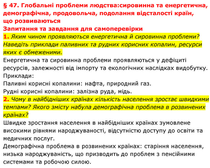 § 47. Глобальні проблеми людства:сировинна та енергетична, демографічна, продовольча, подолання відсталості країн, що розвиваються Запитання та завдання для самоперевірки 1. Яким чином проявляються енергетична й сировинна проблеми? Наведіть приклади паливних та рудних корисних копалин, ресурси яких є обмеженими. Енергетична та сировинна проблеми проявляються у дефіциті ресурсів, залежності від імпорту та екологічних наслідках видобутку. Приклади: Паливні корисні копалини: нафта, природний газ. Рудні корисні копалини: залізна руда, мідь. 2. Чому в найбідніших країнах кількість населення зростає швидкими темпами? Якого змісту набула демографічна проблема в розвинених країнах? Швидке зростання населення в найбідніших країнах зумовлене високими рівнями народжуваності, відсутністю доступу до освіти та медичних послуг. Демографічна проблема в розвинених країнах: старіння населення, низька народжуваність, що призводить до проблем з пенсійними системами та робочою силою.