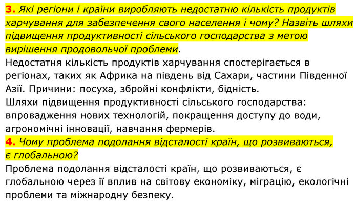3. Які регіони і країни виробляють недостатню кількість продуктів харчування для забезпечення свого населення і чому? Назвіть шляхи підвищення продуктивності сільського господарства з метою вирішення продовольчої проблеми. Недостатня кількість продуктів харчування спостерігається в регіонах, таких як Африка на південь від Сахари, частини Південної Азії. Причини: посуха, збройні конфлікти, бідність. Шляхи підвищення продуктивності сільського господарства: впровадження нових технологій, покращення доступу до води, агрономічні інновації, навчання фермерів. 4. Чому проблема подолання відсталості країн, що розвиваються, є глобальною? Проблема подолання відсталості країн, що розвиваються, є глобальною через її вплив на світову економіку, міграцію, екологічні проблеми та міжнародну безпеку.