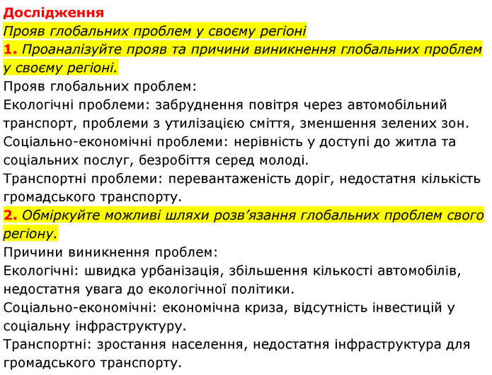 Дослідження Прояв глобальних проблем у своєму регіоні 1. Проаналізуйте прояв та причини виникнення глобальних проблем у своєму регіоні. Прояв глобальних проблем: Екологічні проблеми: забруднення повітря через автомобільний транспорт, проблеми з утилізацією сміття, зменшення зелених зон. Соціально-економічні проблеми: нерівність у доступі до житла та соціальних послуг, безробіття серед молоді. Транспортні проблеми: перевантаженість доріг, недостатня кількість громадського транспорту. 2. Обміркуйте можливі шляхи розв’язання глобальних проблем свого регіону. Причини виникнення проблем: Екологічні: швидка урбанізація, збільшення кількості автомобілів, недостатня увага до екологічної політики. Соціально-економічні: економічна криза, відсутність інвестицій у соціальну інфраструктуру. Транспортні: зростання населення, недостатня інфраструктура для громадського транспорту.