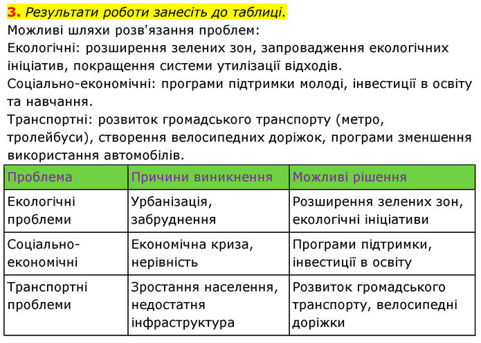 Результати роботи занесіть до таблиці. Можливі шляхи розв'язання проблем: Екологічні: розширення зелених зон, запровадження екологічних ініціатив, покращення системи утилізації відходів. Соціально-економічні: програми підтримки молоді, інвестиції в освіту та навчання. Транспортні: розвиток громадського транспорту (метро, тролейбуси), створення велосипедних доріжок, програми зменшення використання автомобілів. Проблема Причини виникнення Можливі рішення Екологічні проблеми Урбанізація, забруднення Розширення зелених зон, екологічні ініціативи Соціально-економічні Економічна криза, нерівність Програми підтримки, інвестиції в освіту Транспортні проблеми Зростання населення, недостатня інфраструктура Розвиток громадського транспорту, велосипедні доріжки