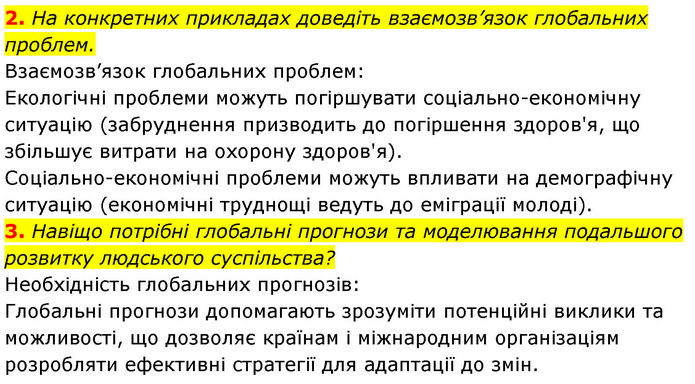 2. На конкретних прикладах доведіть взаємозв’язок глобальних проблем. Взаємозв’язок глобальних проблем: Екологічні проблеми можуть погіршувати соціально-економічну ситуацію (забруднення призводить до погіршення здоров'я, що збільшує витрати на охорону здоров'я). Соціально-економічні проблеми можуть впливати на демографічну ситуацію (економічні труднощі ведуть до еміграції молоді). 3. Навіщо потрібні глобальні прогнози та моделювання подальшого розвитку людського суспільства? Необхідність глобальних прогнозів: Глобальні прогнози допомагають зрозуміти потенційні виклики та можливості, що дозволяє країнам і міжнародним організаціям розробляти ефективні стратегії для адаптації до змін.