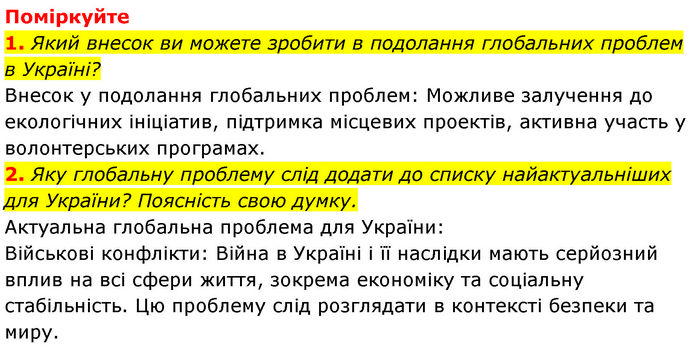 Поміркуйте 1. Який внесок ви можете зробити в подолання глобальних проблем в Україні? Внесок у подолання глобальних проблем: Можливе залучення до екологічних ініціатив, підтримка місцевих проектів, активна участь у волонтерських програмах. 2. Яку глобальну проблему слід додати до списку найактуальніших для України? Поясність свою думку. Актуальна глобальна проблема для України: Військові конфлікти: Війна в Україні і її наслідки мають серйозний вплив на всі сфери життя, зокрема економіку та соціальну стабільність. Цю проблему слід розглядати в контексті безпеки та миру.