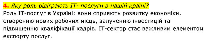 Яку роль відіграють ІТ- послуги в нашій країні? Роль ІТ-послуг в Україні: вони сприяють розвитку економіки, створенню нових робочих місць, залученню інвестицій та підвищенню кваліфікації кадрів. ІТ-сектор стає важливим елементом експорту послуг.