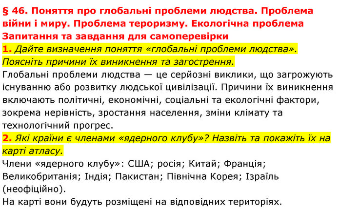 § 46. Поняття про глобальні проблеми людства. Проблема війни і миру. Проблема тероризму. Екологічна проблема Запитання та завдання для самоперевірки 1. Дайте визначення поняття «глобальні проблеми людства». Поясніть причини їх виникнення та загострення. Глобальні проблеми людства — це серйозні виклики, що загрожують існуванню або розвитку людської цивілізації. Причини їх виникнення включають політичні, економічні, соціальні та екологічні фактори, зокрема нерівність, зростання населення, зміни клімату та технологічний прогрес. 2. Які країни є членами «ядерного клубу»? Назвіть та покажіть їх на карті атласу. Члени «ядерного клубу»: США; росія; Китай; Франція; Великобританія; Індія; Пакистан; Північна Корея; Ізраїль (неофіційно). На карті вони будуть розміщені на відповідних територіях.
