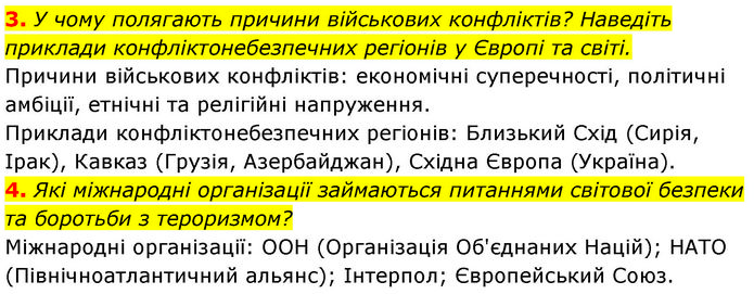3. У чому полягають причини військових конфліктів? Наведіть приклади конфліктонебезпечних регіонів у Європі та світі. Причини військових конфліктів: економічні суперечності, політичні амбіції, етнічні та релігійні напруження. Приклади конфліктонебезпечних регіонів: Близький Схід (Сирія, Ірак), Кавказ (Грузія, Азербайджан), Східна Європа (Україна). 4. Які міжнародні організації займаються питаннями світової безпеки та боротьби з тероризмом? Міжнародні організації: ООН (Організація Об'єднаних Націй); НАТО (Північноатлантичний альянс); Інтерпол; Європейський Союз.