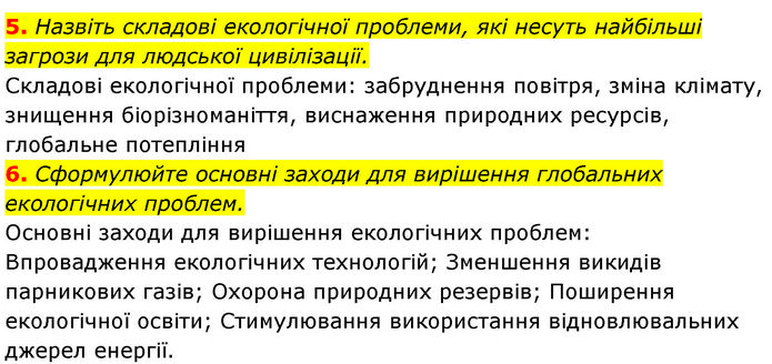 5. Назвіть складові екологічної проблеми, які несуть найбільші загрози для людської цивілізації. Складові екологічної проблеми: забруднення повітря, зміна клімату, знищення біорізноманіття, виснаження природних ресурсів, глобальне потепління 6. Сформулюйте основні заходи для вирішення глобальних екологічних проблем. Основні заходи для вирішення екологічних проблем: Впровадження екологічних технологій; Зменшення викидів парникових газів; Охорона природних резервів; Поширення екологічної освіти; Стимулювання використання відновлювальних джерел енергії.