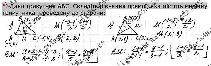 Дано трикутник АВС. Складіть рівняння прямої, яка містить медіану трикутника, проведену до сторони: