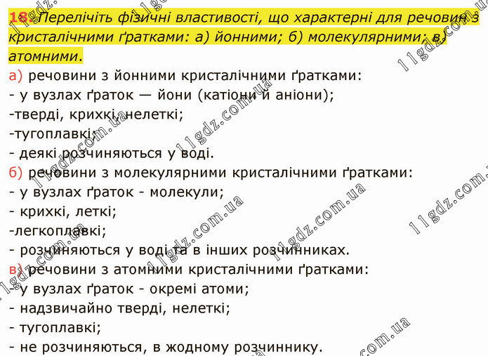 Перелічіть фізичні властивості, що характерні для речовин з кристалічними ґратками: а) йонними; б) молекулярними; в) атомними. а) речовини з йонними кристалічними ґратками: - у вузлах ґраток — йони (катіони й аніони); -тверді, крихкі, нелеткі; -тугоплавкі; - деякі розчиняються у воді. б) речовини з молекулярними кристалічними ґратками: - у вузлах ґраток - молекули; - крихкі, леткі; -легкоплавкі; - розчиняються у воді та в інших розчинниках. в) речовини з атомними кристалічними ґратками: - у вузлах ґраток - окремі атоми; - надзвичайно тверді, нелеткі; - тугоплавкі; - не розчиняються, в жодному розчиннику.