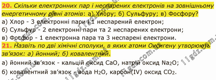 Скільки електронних пар і неспарених електронів на зовнішньому енергетичному рівні атомів: а) Хлору; б) Сульфуру; в) Фосфору? а) Хлор - 3 електронні пари і 1 неспарений електрон; б) Сульфур - 2 електронні пари та 2 неспарених електрони; в) Фосфор - 1 електронна пара та 3 неспарені електрони. 21. Назвіть по дві хімічні сполуки, в яких атоми Оксигену утворюють зв’язок: а) йонний; б) ковалентний. а) йонний зв’язок - кальцій оксид СаО, натрій оксид Na2О; б) ковалентний зв’язок - вода Н2О, карбон(IV) оксид СО2.