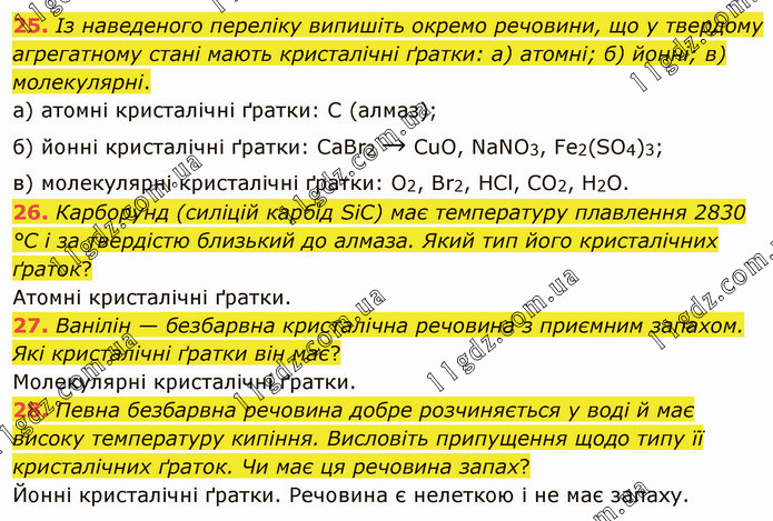 Із наведеного переліку випишіть окремо речовини, що у твердому агрегатному стані мають кристалічні ґратки: а) атомні; б) йонні; в) молекулярні. а) атомні кристалічні ґратки: С (алмаз); б) йонні кристалічні ґратки: СаВr2 → СuО, NaNО3, Fe2(SО4)3; в) молекулярні кристалічні ґратки: О2, Вr2, НСl, СО2, Н2О. 26. Карборунд (силіцій карбід SiС) має температуру плавлення 2830 °С і за твердістю близький до алмаза. Який тип його кристалічних ґраток? Атомні кристалічні ґратки. 27. Ванілін — безбарвна кристалічна речовина з приємним запахом. Які кристалічні ґратки він має? Молекулярні кристалічні ґратки. 28. Певна безбарвна речовина добре розчиняється у воді й має високу температуру кипіння. Висловіть припущення щодо типу її кристалічних ґраток. Чи має ця речовина запах? Йонні кристалічні ґратки. Речовина є нелеткою і не має запаху.