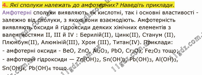 Які сполуки належать до амфотерних? Наведіть приклади. Амфотерні сполуки виявляють як кислотні, так і основні властивості - залежно від сполуки, з якою вони взаємодіють. Амфотерність виявляють оксиди й гідроксиди деяких хімічних елементів з валентностями II, III й IV : Берилій(ІІ), Цинк(ІІ), Станум (ІІ), Плюмбум(ІІ), Алюміній(ІІІ), Хром (ІІІ), Титан(ІV). Приклади: - амфотерні оксиди - ВеО, ZnО, Аl2O3, РbО, Сr2O3, Fе2O3 тощо; - амфотерні гідроксиди — Zn(OH)2, Sn(ОН)2, Рb(ОН)3, Аl(ОН)3, Sn(ОН)4, Рb(ОН)4 тощо.