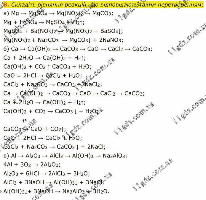 Складіть рівняння реакцій, що відповідають таким перетворенням: а) Mg → MgSО4 → Mg(NО3)2 → MgCО3; Mg + H2SО4 → MgSО4 + H2↑; MgSО4 + Ba(NО3)2 → Mg(NО3)2 + BaSО4↓; Mg(NО3)2 + Na2CО3 → MgCО3↓ + 2NaNО3; б) Ca → Ca(OH)2 → CaCО3 → CaO → CaCl2 → CaCО3; Ca + 2H2O → Ca(OH)2 + H2↑; Ca(OH)2 + CО2 ↑ CaCО3 + H2О; CaO = 2HCl → CaCl2 + H2О; CaCl2 + Na2CО3 → CaCО3 +2NaCl2; Ca → Ca(ОH)2 → CaCО3 → CaO → CaCl2 → CaCО3; Ca + 2H2О → Ca(OH)2 + H2↑; Ca(OH)2 + CО2 → CaCО3 ↓ + H2О; t° CaCО3 → CaO + CО2↑; CaO + 2HCl → CaCl2 + H2О; CaCl2 + Na2CО3 → CaCО3 ↓ + 2NaCl; в) Al → Al2О3 → AlCl3 → Al(ОH)3 → Na2AlО3; 4Al + 3О2 → 2Al2О3; Al2О3 + 6HCl → 2AlCl3 + 3H2О; AlCl3 + 3NaOH → Al(OH)3↓ + 3NaCl; Al(OH)3↓+ 3NaOH → Na3AlО3 + 3H2О.