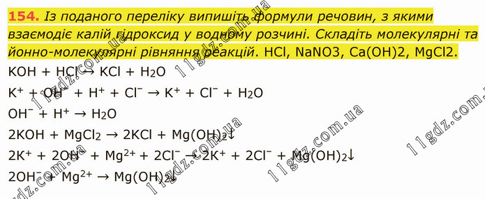 Із поданого переліку випишіть формули речовин, з якими взаємодіє калій гідроксид у водному розчині. Складіть молекулярні та йонно-молекулярні рівняння реакцій. HCl, NaNO3, Ca(OH)2, MgCl2. KOH + HCl → KCl + H2О K+ + OH– + H+ + Cl– → K+ + Cl– + H2О OH– + H+ → H2О 2KОH + MgCl2 → 2KCl + Mg(OH)2↓ 2К+ + 2ОН– + Мg2+ + 2Сl– → 2К+ + 2Сl– + Мg(ОН)2↓ 2ОН– + Mg2+ → Мg(ОН)2↓