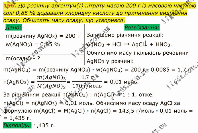 До розчину аргентум(I) нітрату масою 200 г із масовою часткою солі 0,85 % додавали хлоридну кислоту до припинення виділення осаду. Обчисліть масу осаду, що утворився. Розв’язання: Запишемо рівняння реакції: АgNO3 + НСl → АgСl↓ + НNO3. Обчислимо масу і кількість речовини АgNО3 у розчині: m(АgNО3) = m(розчину АgNО3) ∙ w(АgNО3) = 200 г ∙ 0,0085 = 1,7 г n(АgNО3) = (m(AgNO)_3)/(M(AgNO)_3 )= (1,7 г)/(170 г/моль) = 0,01 моль. За рівнянням реакції n(АgNО3) : n(АgСl) = 1 : 1, отже, n(АgСl) = n(АgNО3) = 0,01 моль. Обчислимо масу осаду АgСl за формулою m(АgСl) = М(АgСl) ∙ n(АgСl) = 143,5 г/моль ∙ 0,01 моль = = 1,435 г. Відповідь: 1,435 г.