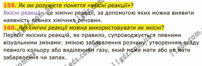 Як ви розумієте поняття «якісні реакції»? Якісні реакції - це хімічні реакції, за допомогою яких можна виявити наявність певних хімічних речовин. 160. Які хімічні реакції можна використовувати як якісні? Перебіг якісних реакцій, як правило, супроводжується певними візуальними змінами: зміною забарвлення розчину, утворенням осаду певного кольору або виділенням газу, який може мати або не мати забарвлення чи запах.