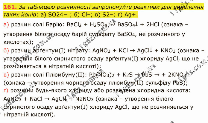 За таблицею розчинності запропонуйте реактиви для виявлення таких йонів: a) SO24− ; б) Cl–; в) S2–; г) Ag+. а) розчин солі Барію: ВаСl2 + Н2SО4 → ВаSО4↓ + 2НСl (ознака – утворення білого осаду барій сульфату ВаSО4, не розчинного у кислотах); б) розчин арґентум(І) нітрату: АgNO3 + КСl → AgCl↓ + КNO3 (ознака – утворення білого сирнистого осаду арґентум(І) хлориду АgСl, що не розчиняється в нітратній кислоті); в) розчин солі Плюмбуму(ІІ): Рb(NО3)2 + К2S → РbS → + 2КNО3 (ознака — утворення чорного осаду плюмбум(ІІ) сульфіду РbS); г) розчини будь-якого хлориду або розведена хлоридна кислота: AgNO3 + NаСl → АgСl↓ + NаNO3 (ознака – утворення білого сирнистого осаду арґентум(І) хлориду АgСl, що не розчиняється у нітратній кислоті).