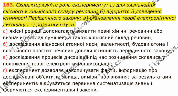 Схарактеризуйте роль експерименту: а) для визначення якісного й кількісного складу речовин; б) відкриття й доведення істинності Періодичного закону; в) становлення теорії електролітичної дисоціації; г) розвитку науки. а) якісні реакції допомагають виявити певні хімічні речовини або визначити склад сумішей, а також кількісний склад речовин; б) дослідження відносної атомної маси, валентності, будови атома і властивості простих речовин довели істинність періодичного закону; в) дослідження процесів дисоціації під час розчинення склалися у положення теорії електролітичної дисоціації; г) експеримент дозволяє накопичувати факти, інформацію про досліджувані об’єкти та явища, виміри, порівняння; за результатами експериментів відбувається первинна систематизація знань і формуються експериментальні закони.