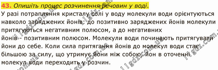 Опишіть процес розчинення речовин у воді. У разі потрапляння кристалу солі у воду молекули води орієнтуються навколо заряджених йонів: до позитивно заряджених йонів молекули притягуються негативним полюсом, а до негативних йонів - позитивним полюсом. Молекули води починають притягувати йони до себе. Коли сила притягання йонів до молекул води стає більшою за силу, що утримує йони між собою, йон в оточенні молекул води переходить у розчин.