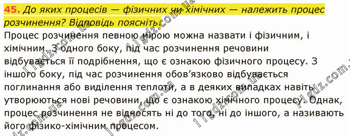 До яких процесів — фізичних чи хімічних — належить процес розчинення? Відповідь поясніть. Процес розчинення певною мірою можна назвати і фізичним, і хімічним. З одного боку, під час розчинення речовини відбувається її подрібнення, що є ознакою фізичного процесу. З іншого боку, під час розчинення обов’язково відбувається поглинання або виділення теплоти, а в деяких випадках навіть утворюються нові речовини, що є ознакою хімічного процесу. Однак, процес розчинення не відносять ні до того, ні до іншого, а називають його фізико-хімічним процесом.