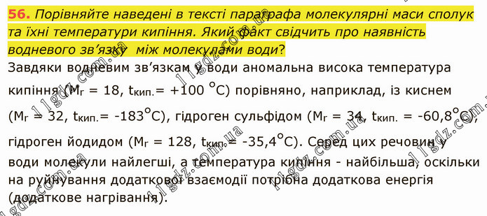 Порівняйте наведені в тексті параграфа молекулярні маси сполук та їхні температури кипіння. Який факт свідчить про наявність водневого зв’язку між молекулами води? Завдяки водневим зв’язкам у води аномальна висока температура кипіння (Мr = 18, tкип.= +100 °С) порівняно, наприклад, із киснем (Мr = 32, tкип.= -183°С), гідроген сульфідом (Мr = 34, tкип. = -60,8°С), гідроген йодидом (Мr = 128, tкип.= -35,4°С). Серед цих речовин у води молекули найлегші, а температура кипіння - найбільша, оскільки на руйнування додаткової взаємодії потрібна додаткова енергія (додаткове нагрівання).