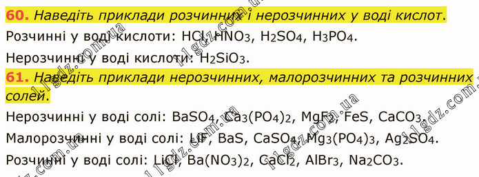 Наведіть приклади розчинних і нерозчинних у воді кислот. Розчинні у воді кислоти: НСl, HNO3, Н2SO4, Н3РO4. Нерозчинні у воді кислоти: Н2SiO3. 61. Наведіть приклади нерозчинних, малорозчинних та розчинних солей. Нерозчинні у воді солі: ВаSO4, Са3(РO4)2, МgF2, FеS, СаСО3. Малорозчинні у воді солі: LiF, ВаS, СаSО4, Мg3(РO4)3, Аg2SO4. Розчинні у воді солі: LiСl, Ва(NO3)2, СаСl2, АlВr3, Nа2СО3.