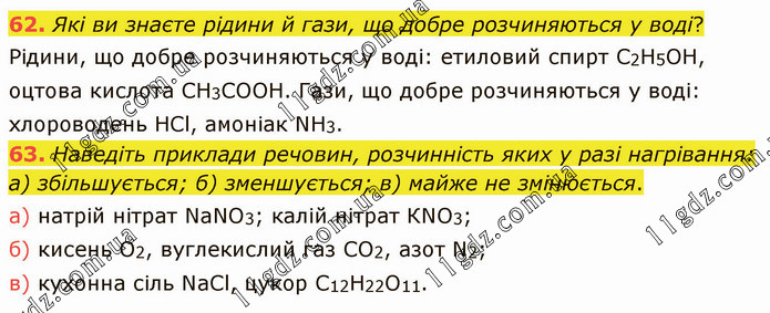 Які ви знаєте рідини й гази, що добре розчиняються у воді? Рідини, що добре розчиняються у воді: етиловий спирт С2Н5ОН, оцтова кислота СН3СООН. Гази, що добре розчиняються у воді: хлороводень НСl, амоніак NH3. 63. Наведіть приклади речовин, розчинність яких у разі нагрівання: а) збільшується; б) зменшується; в) майже не змінюється. а) натрій нітрат NаNО3; калій нітрат КNO3; б) кисень O2, вуглекислий газ СO2, азот N2; в) кухонна сіль NaCl, цукор С12Н22O11.