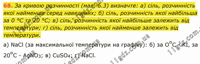 За кривою розчинності (мал. 6.3) визначте: а) сіль, розчинність якої найменша серед наведених; б) сіль, розчинність якої найбільша за 0 °С та 20 °С; в) сіль, розчинність якої найбільше залежить від температури; г) сіль, розчинність якої найменше залежить від температури. а) NаСl (за максимальної температури на графіку): б) за О°С - КІ, за 20°С - AgNO3; в) СuSO4; г) NаСl.