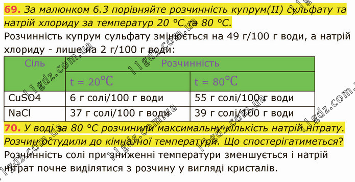 За малюнком 6.3 порівняйте розчинність купрум(ІІ) сульфату та натрій хлориду за температур 20 °С та 80 °С. Розчинність купрум сульфату змінюється на 49 г/100 г води, а натрій хлориду - лише на 2 г/100 г води: У воді за 80 °С розчинили максимальну кількість натрій нітрату. Розчин остудили до кімнатної температури. Що спостерігатиметься? Розчинність солі при зниженні температури зменшується і натрій нітрат почне виділятися з розчину у вигляді кристалів.