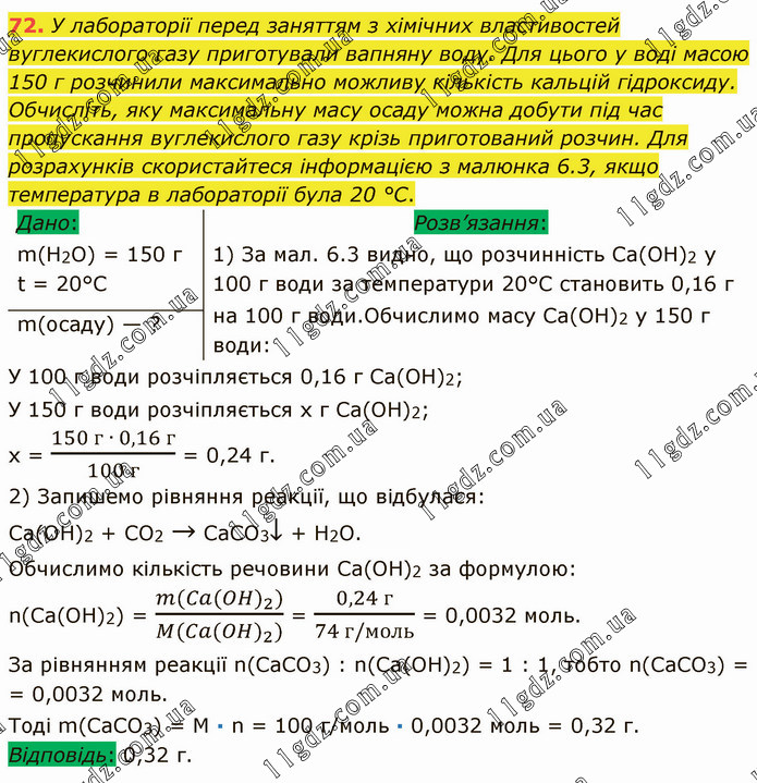 У лабораторії перед заняттям з хімічних властивостей вуглекислого газу приготували вапняну воду. Для цього у воді масою 150 г розчинили максимально можливу кількість кальцій гідроксиду. Обчисліть, яку максимальну масу осаду можна добути під час пропускання вуглекислого газу крізь приготований розчин. Для розрахунків скористайтеся інформацією з малюнка 6.3, якщо температура в лабораторії була 20 °С. Розв’язання: 1) За мал. 6.3 видно, що розчинність Са(ОН)2 у 100 г води за температури 20°С становить 0,16 г на 100 г води.Обчислимо масу Са(ОН)2 у 150 г води: У 100 г води розчіпляється 0,16 г Са(ОН)2; У 150 г води розчіпляється х г Са(ОН)2; x = (150 г ∙ 0,16 г)/(100 г) = 0,24 г. 2) Запишемо рівняння реакції, що відбулася: Са(ОН)2 + СО2 → СаСО3↓ + Н2О. Обчислимо кількість речовини Са(ОН)2 за формулою: n(Ca(OH)2) = (m(Ca(OH)_2))/(M(Ca(OH)_2)) = (0,24 г)/(74 г/моль) = 0,0032 моль. За рівнянням реакції n(СаСO3) : n(Са(ОН)2) = 1 : 1, тобто n(СаСO3) = = 0,0032 моль. Тоді m(CaCO3) = М ∙ n = 100 г/моль ∙ 0,0032 моль = 0,32 г. Відповідь: 0,32 г.