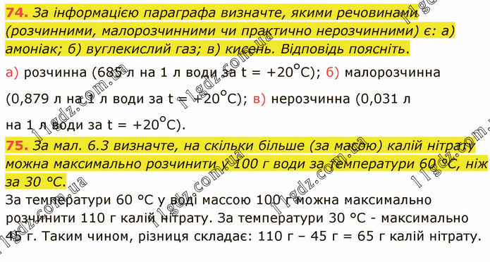 За інформацією параграфа визначте, якими речовинами (розчинними, малорозчинними чи практично нерозчинними) є: а) амоніак; б) вуглекислий газ; в) кисень. Відповідь поясніть. а) розчинна (685 л на 1 л води за t = +20°С); б) малорозчинна (0,879 л на 1 л води за t = +20°С); в) нерозчинна (0,031 л на 1 л води за t = +20°С). 75. За мал. 6.3 визначте, на скільки більше (за масою) калій нітрату можна максимально розчинити у 100 г води за температури 60 °С, ніж за 30 °С. За температури 60 °С у воді массою 100 г можна максимально розчинити 110 г калій нітрату. За температури 30 °С - максимально 45 г. Таким чином, різниця складає: 110 г – 45 г = 65 г калій нітрату.
