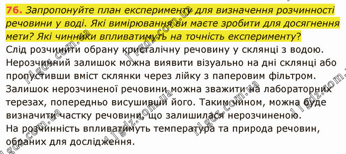 Запропонуйте план експерименту для визначення розчинності речовини у воді. Які вимірювання ви маєте зробити для досягнення мети? Які чинники впливатимуть на точність експерименту? Слід розчинити обрану кристалічну речовину у склянці з водою. Нерозчинний залишок можна виявити візуально на дні склянці або пропустивши вміст склянки через лійку з паперовим фільтром. Залишок нерозчиненої речовини можна зважити на лабораторних терезах, попередньо висушивши його. Таким чином, можна буде визначити частку речовини, що залишилася нерозчиненою. На розчинність впливатимуть температура та природа речовин, обраних для дослідження.