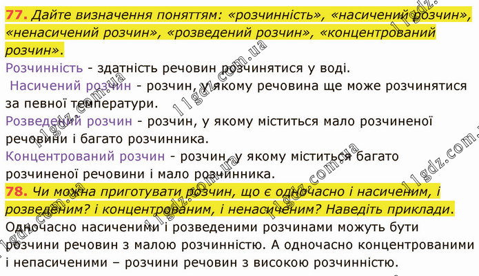 Дайте визначення поняттям: «розчинність», «насичений розчин», «ненасичений розчин», «розведений розчин», «концентрований розчин». Розчинність - здатність речовин розчинятися у воді. Насичений розчин - розчин, у якому речовина ще може розчинятися за певної температури. Розведений розчин - розчин, у якому міститься мало розчиненої речовини і багато розчинника. Концентрований розчин - розчин, у якому міститься багато розчиненої речовини і мало розчинника. 78. Чи можна приготувати розчин, що є одночасно і насиченим, і розведеним? і концентрованим, і ненасиченим? Наведіть приклади. Одночасно насиченими і розведеними розчинами можуть бути розчини речовин з малою розчинністю. А одночасно концентрованими і непасиченими – розчини речовин з високою розчинністю.