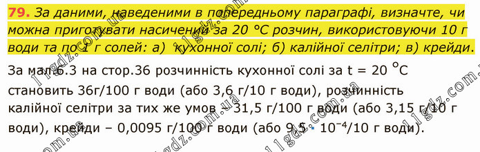 За даними, наведеними в попередньому параграфі, визначте, чи можна приготувати насичений за 20 °С розчин, використовуючи 10 г води та по 1 г солей: а) кухонної солі; б) калійної селітри; в) крейди. За мал.6.3 на стор.36 розчинність кухонної солі за t = 20 °С становить 36г/100 г води (або 3,6 г/10 г води), розчинність калійної селітри за тих же умов – 31,5 г/100 г води (або 3,15 г/10 г води), крейди – 0,0095 г/100 г води (або 9,5 ∙ 10–4/10 г води).