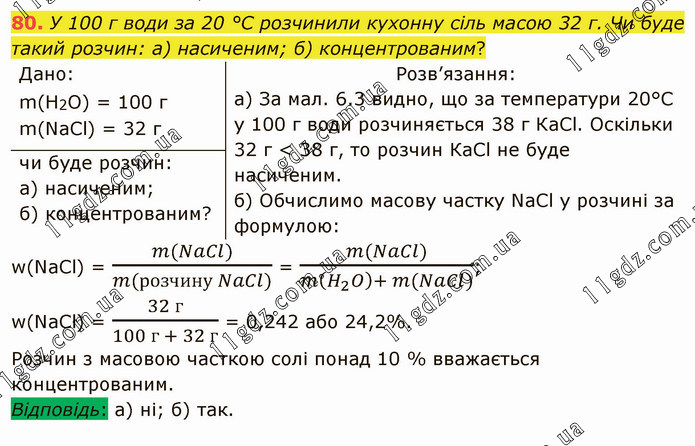 У 100 г води за 20 °С розчинили кухонну сіль масою 32 г. Чи буде такий розчин: а) насиченим; б) концентрованим? Розв’язання: а) За мал. 6.3 видно, що за температури 20°С у 100 г води розчиняється 38 г КаСl. Оскільки 32 г < 38 г, то розчин КаСl не буде насиченим. б) Обчислимо масову частку NaCl у розчині за формулою: w(NaCl) = (m(NaCl))/(m(розчину NaCl)) = (m(NaCl))/(m(H_2 O)+ m(NaCl)); w(NaCl) = (32 г)/(100 г + 32 г) = 0,242 або 24,2%. Розчин з масовою часткою солі понад 10 % вважається концентрованим. Відповідь: а) ні; б) так.
