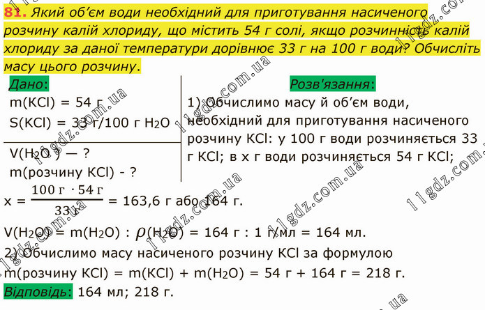 Який об’єм води необхідний для приготування насиченого розчину калій хлориду, що містить 54 г солі, якщо розчинність калій хлориду за даної температури дорівнює 33 г на 100 г води? Обчисліть масу цього розчину. Розв'язання: 1) Обчислимо масу й об’єм води, необхідний для приготування насиченого розчину КСl: у 100 г води розчиняється 33 г КСl; в х г води розчиняється 54 г КСl; x = (100 г ∙ 54 г)/(33 г) = 163,6 г або 164 г. V(H2О) = m(H2О) : ρ(Н2О) = 164 г : 1 г/мл = 164 мл. 2) Обчислимо масу насиченого розчину КСl за формулою m(розчину КСl) = m(КСl) + m(Н2O) = 54 г + 164 г = 218 г. Відповідь: 164 мл; 218 г.